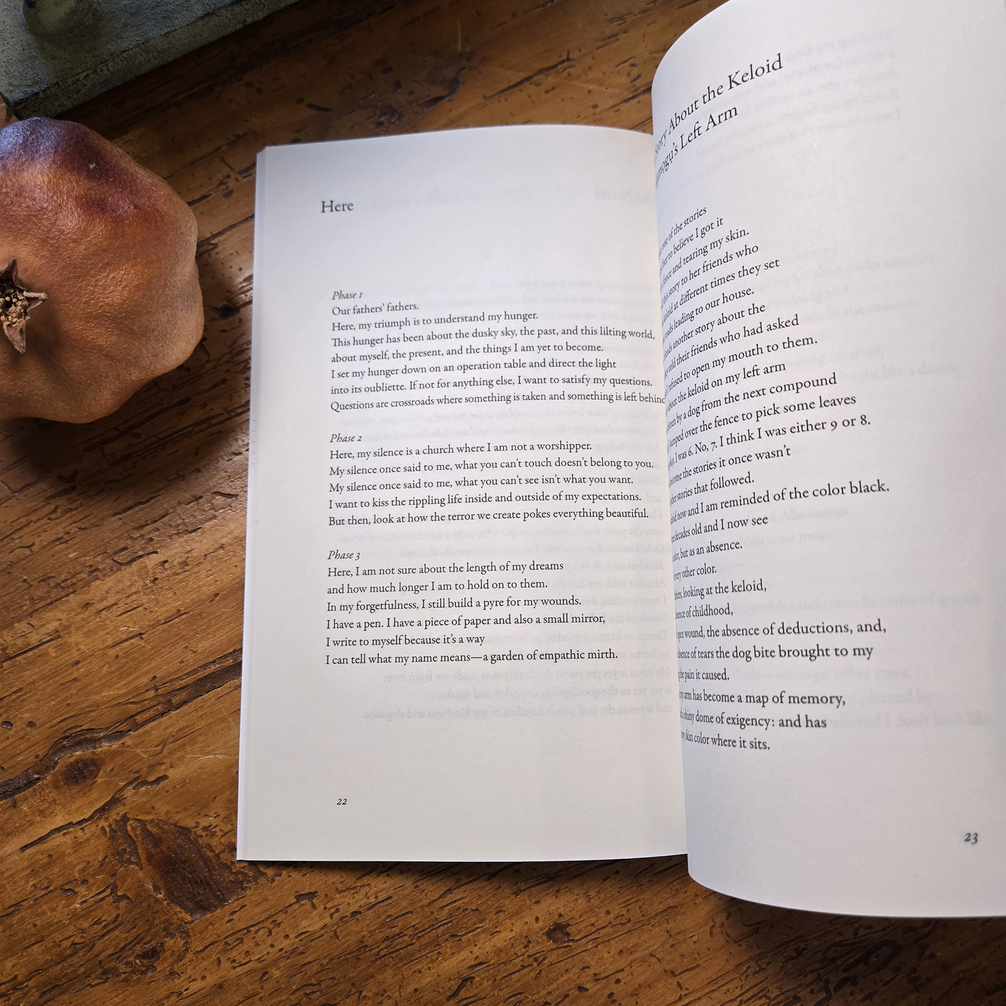Images: 1. The collection on a stand with a pomegranate, a horse sculpture, and an hourglass. 2. Interior pages from the collection. 3. Interior pages from The Naming alongside a dried pomegranate.