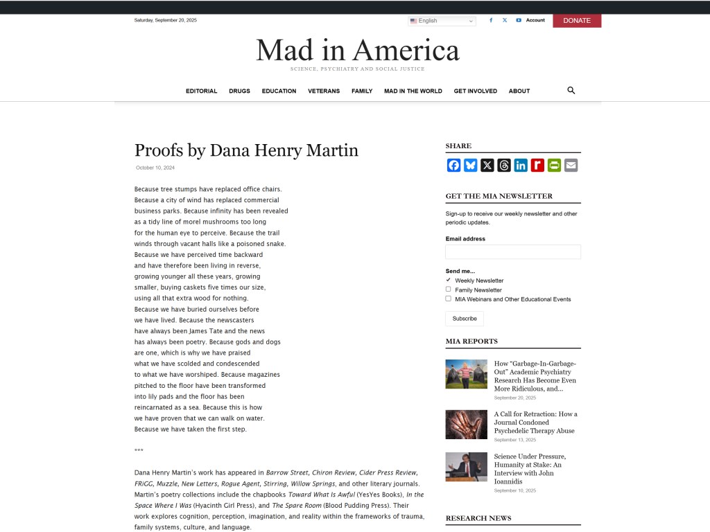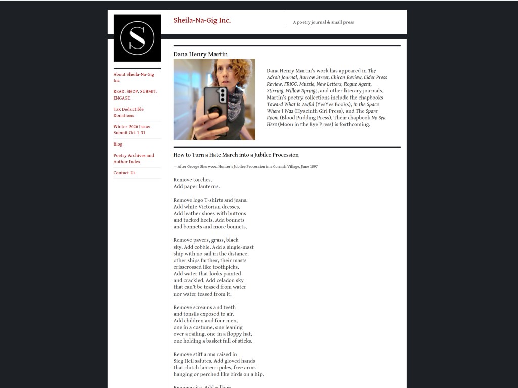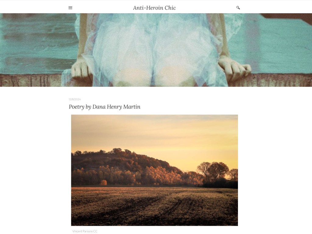 The Adriot Journal, Alice Blue, Anti-Heroin Chic, Arsenic Lobster, Babel Fruit, Barrow Street, Blood Orange Review, Blossombones, Blue Fifth Review, Boxcar Poetry Review, Buddhist Poetry Review, Canopic Jar, Chiron Review, Cider Press Review (past work under the name M Ross Henry and forthcoming work under the name Dana Henry Martin), Delirious Hem, Dusie, Failbetter, The Far Field, Fence, FRiGG, Hobble Creek Review, I-70 Review, Laurel Review (forthcoming), Juked, Kansas City Voices, Knockout Literary Magazine, Lily Poetry Review (forthcoming), The Literary Bohemian, Melville House Blog, Meat for Tea, Muzzle (under the name M Ross Henry), New Letters (under the name M Ross Henry), O Sweet and Flowery Roses, ONE ART, Ouroboros Review, Pif Magazine, Press 1, Prick of the Spindle, Poems Rethabile Likes, SWWIM, Qarrtsiluni, Rockhurst Review, Rogue Agent, Sheila-Na-Gig, The Smoking Poet, Stirring, Sugar House Review (forthcoming), Telephone (forthcoming), Thimble Literary Magazine, Thirteen Myna Birds, Trampoline Poetry, Vinyl Poetry, Weave Magazine, Whale Sound, Wicked Alice, Willow Springs (under the name M Ross Henry), Word Riot