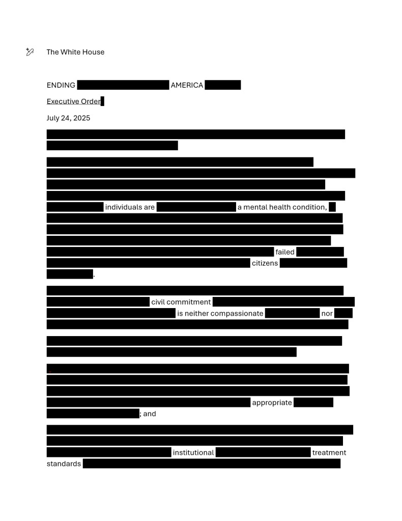 Given that Fox News host Brian Kilmeade just called for people who are unhoused or have mental-health diagnostic labels to be killed by way of involuntary lethal injection, I’m sharing two erasure poems that use the July 24 executive order as their source text. Nobody, including poets, seems to be aware of the existence of this horrific executive order. This is the second erasure.